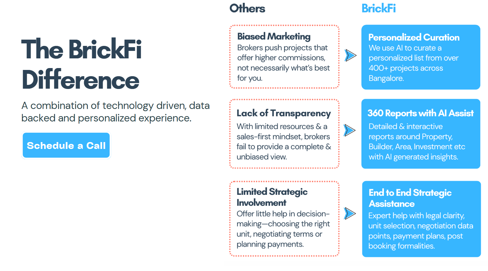 Traditional advisories often operate without a tech backbone, pushing select properties for higher commissions with minimal accountability. On the other side, you have BrickFi, a platform that brings together RERA-verified projects, AI-generated 360° reports, legal clarity, and unbiased consulting that’s more aligned with your goals than your wallet size.